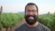Adult male standing in front of vineyard laughs heavily while looking at camera - 4K stock video
