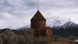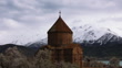 Armenian church stands amidst trees, with a backdrop of snowy mountains under a cloudy sky
