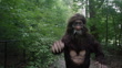 Bigfoot waves his arms while walking toward camera in a wooded path in a park