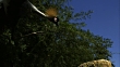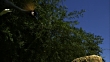 A crowned crane lands on a tree stump.