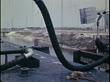 / Flatbed barge is pushed up the bayou / Oil from barges being pumped into tanks / Oil being burned, with components pumped through pipes / Various pipes and tanks / Refinery worker screwing a pipe onto a tank to take a sample / Sample being injected into chromatograph.
