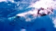 Swimming in deep, turquoise sea. Divers admiring dolphin family