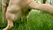Slow motion close up shot of a dog poops on the grass.