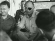 B/W 1967 General Moshe Dayan with eyepatch sitting + talking with other men / newsreel