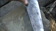 High Angle hand-held zoom-in - An Indonesian native sharpens a machete on a rock. / Indonesia - HD stock video