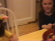 VHS video from 2001 of two young children wearing costumes showing off their halloween candy to the camera at the kitchen table