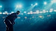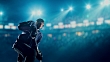 Ice Hockey Player in action on a professional hockey arena with intensional lens flares. He is wearing unbranded sports clothes.