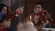 Medieval feast at candelit table, people talking, laughing and eating, raising glasses - Medieval Era Reenactment (Footage by Like A Shot/Getty Images)