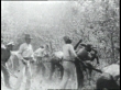 1907 WS men with machetes hacking at trees and men behind them raking the ground as a supervisor is watching / Republic of Panama