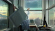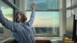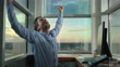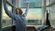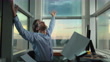 Slow motion video of businessman celebrating successfully closed deal by throwing papers in the air in his office.