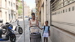 Full length view of mid adult Black woman and 6 year old girl, both in casual clothing, approaching camera on sidewalk, smiling and talking.