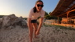 Brother and sister is lying in a hammock, while their mother is standing next to them, they are having fun together on the beach in sunset.