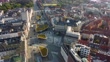 Cityscape over central Copenhagen with Nørreport Station and its yellow, public busses driven by electricity in the foreground. This modern station serves as a public bus station, electric S-trains, the metro and main line railway station. It is one of the busiest stations in Denmark, serving 165,000 commuters daily. Supporting public transportation and biodiversity with its grass covered rooftops, this modern architecture supports Copenhagen as a sustainable smart city. 4k drone footage.