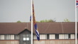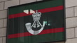 Queen visits 4th Battalion The Ranger Regiment in Aldershot; ENGLAND: Surrey: Aldershot:INTGV 4th Battalion The Ranger Regiment ensign in frame on wallEXTVarious of Royal Standard flying on flagpoles with company standard and Union Jack Flag on polesINTGV close up of Ranger Regiment logo in frame on wallGV close up of Ranger ensign pin broach in presentation box on tableGV close up hand written message in regiment guestbook (unsigned)