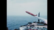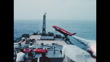 Rocket launched at forty five degree angle from ship; men watch in FG.