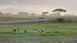 Wide shot of a safari vehicle moving on the road, with an ibis and grey crowned cranes grazing in the foreground / Kenya. Captured with Arri Alexa camera in Amboseli National Park.