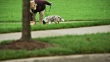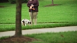 A small dog defecates in the grass in a park during a rainstorm and its owner picks up the poop in a plastic bag. - 4K stock video