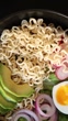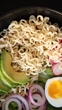 Vegetarian noodle bowl avocado, noodles, egg, vegetables tasty snack fresh delicious gourmet food background on the table rustic food top view copy space keto and paleo diet vegetarian food - HD stock video
