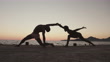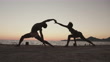 Girlfriend and boyfriend doing stretching exercise on pier by sea during sunset