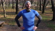 Relaxed adult man breathing fresh air in a forest with green trees in the background
